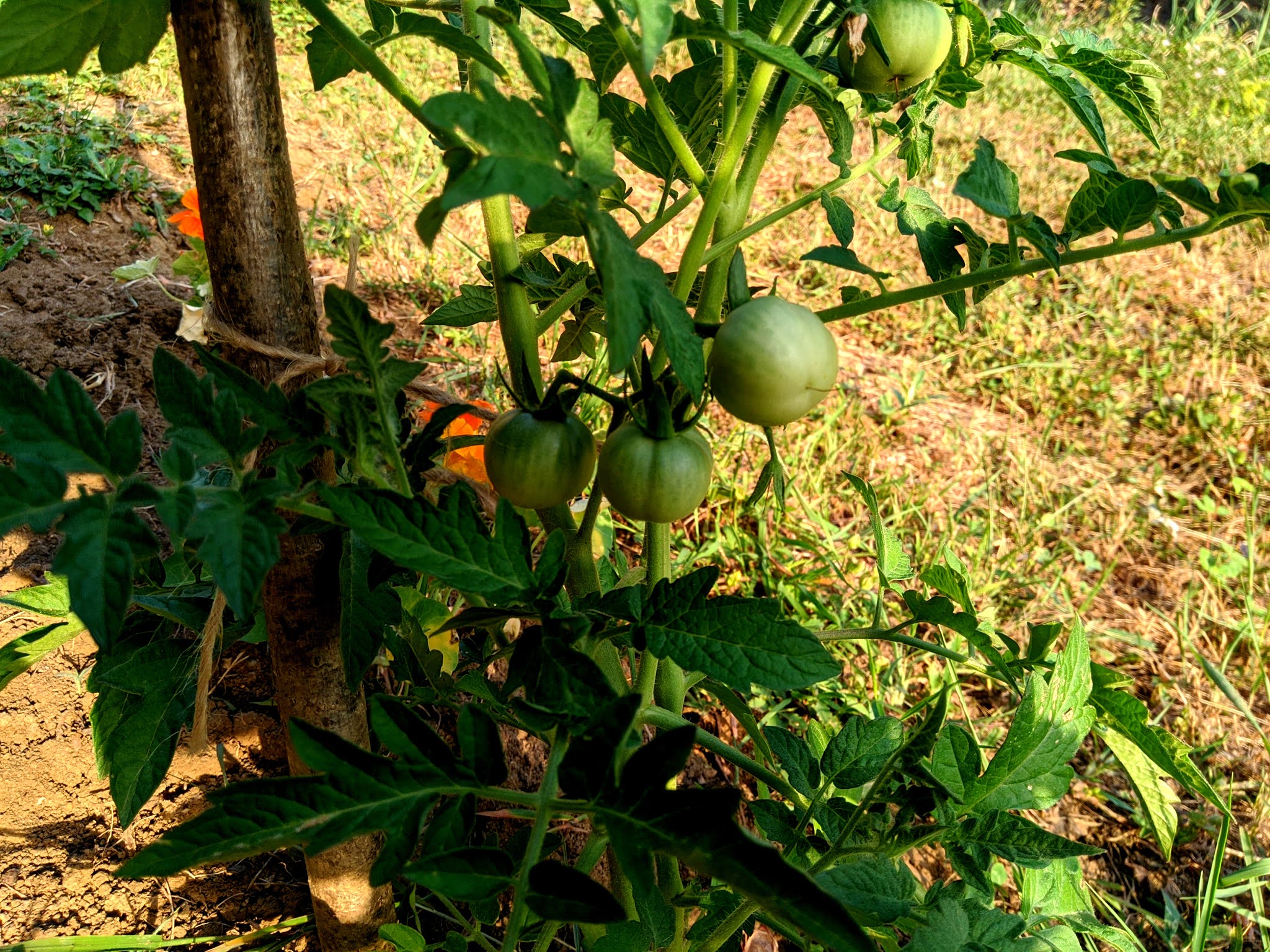 Tomatoes couldn’t wait for this heat. They are growing fruits and flowering like mad. The difference in height and flower number can be seen daily.